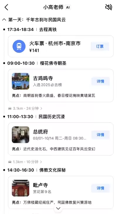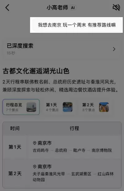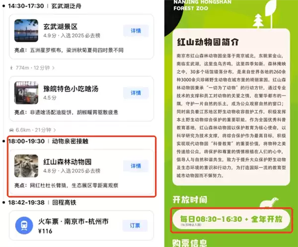 但实际体验下来,这个功能,就,一言难尽。。。以南京周末两日游给出的规划为例,其中 18 点到 19 点 30 推荐大家去红山动物园。