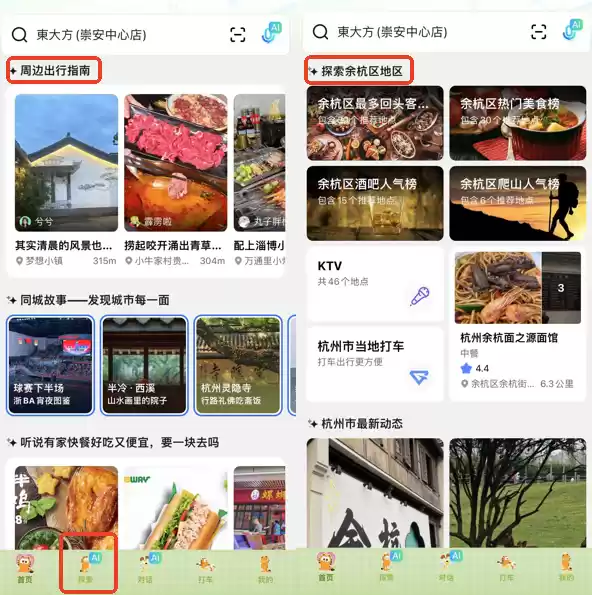 首先,更新后,高德多了一个 AI 探索的板块,它会结合你当下的位置、时间以及过往出行数据推荐目的地,带你发现新大陆。比如你老是周末导航去饭馆,那它可能就会给你推荐周围小众好吃的馆子。