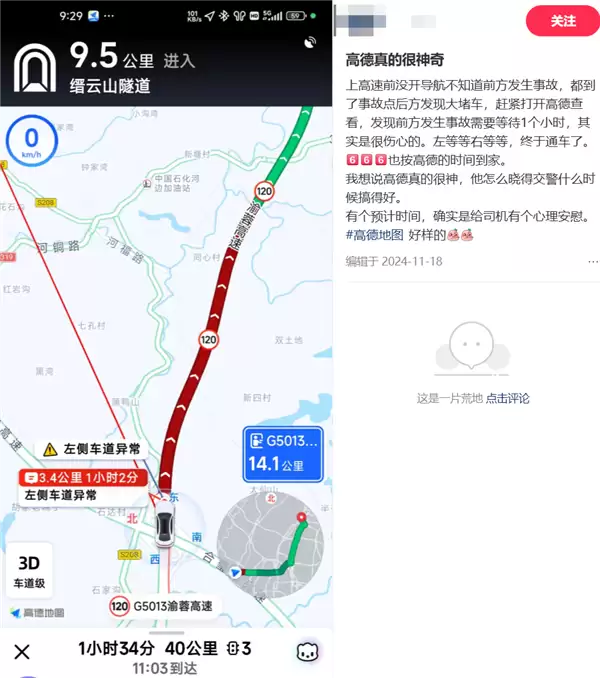 那么,除了上述更新外,剩下是相对常规的更新。比如驾驶体验的升级,超越物理视野,补足行车盲区。这事其实高德一直在做,会提前告知多个路口的红绿灯倒计时,暴雨时会给你一个积水地图,现在还会推荐最优车道,提前预警夜间对向来车风险,预判前方数公里的拥堵。