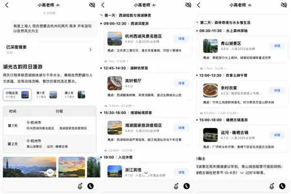 怎么说呢。。。AI 果然不能替代人类。再比如,世超想要在杭州游玩两天,开车游玩,以自然风光为主。AI 倒是列出了些符合条件的景点: