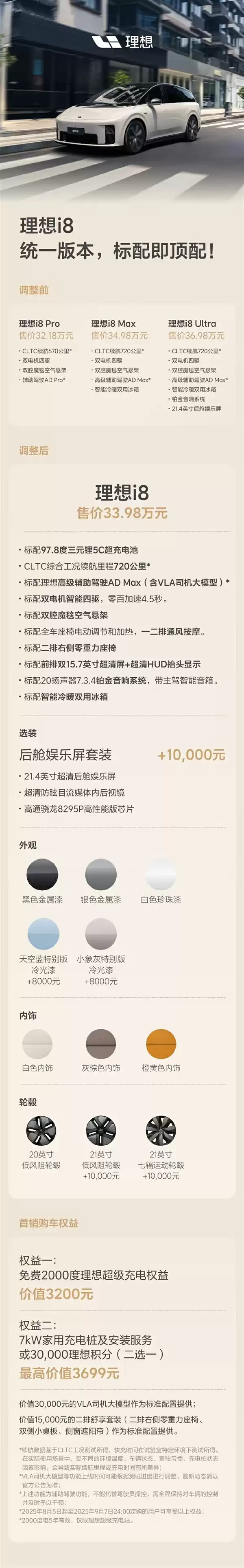 感谢广大用户对理想汽车的喜爱和信赖,理想汽车决定统一配置版本——以理想i8 Max作为标准配置,并将售价从34.98万元调整为33.98万元。