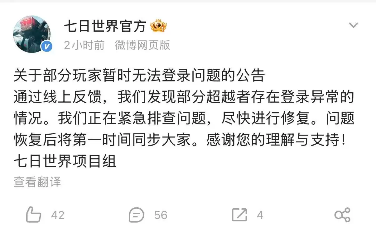 随后,《七日世界》官方发布公告回应:"我们发现部分玩家遭遇登录异常问题,技术团队正在全力排查原因并将尽快修复,恢复正常后将第一时间通知各位。"