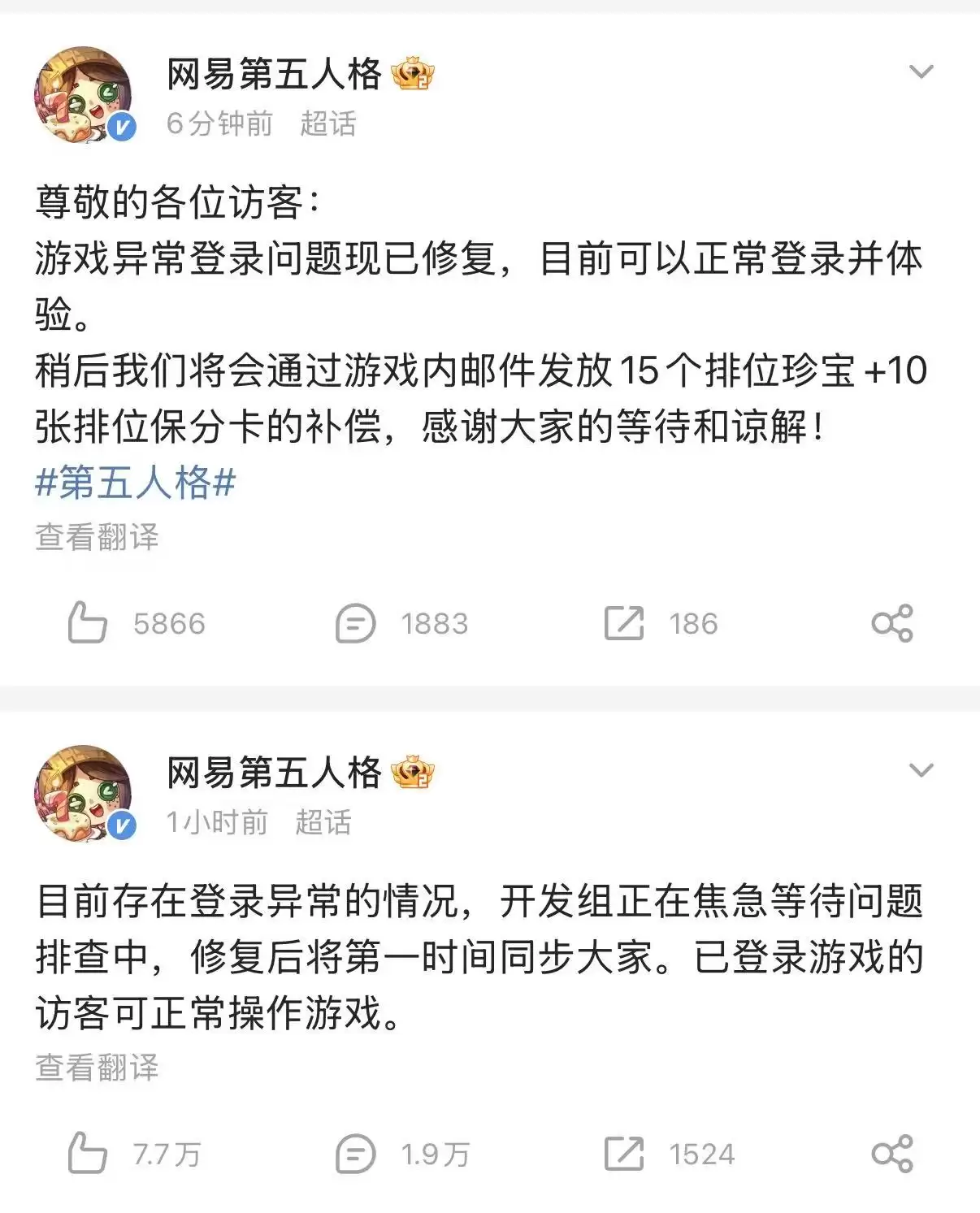 大约一小时后,《第五人格》再次发布公告确认:"游戏登录问题已修复,现在可正常进入游戏。我们将通过游戏内邮件发放15个排位珍宝和10张排位保分卡作为补偿,感谢大家的理解与耐心等待。"