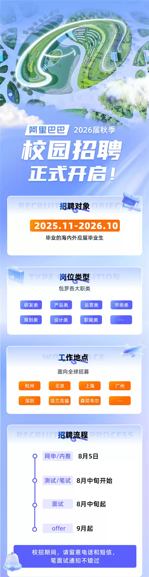 本次校招覆盖阿里巴巴控股集团、淘天集团、阿里云、阿里国际数字商业集团、通义实验室、智能信息事业群、钉钉和高德等15大业务板块,所有招聘均同步开展。