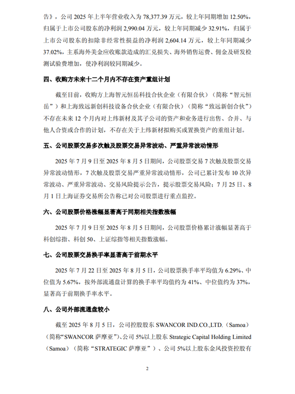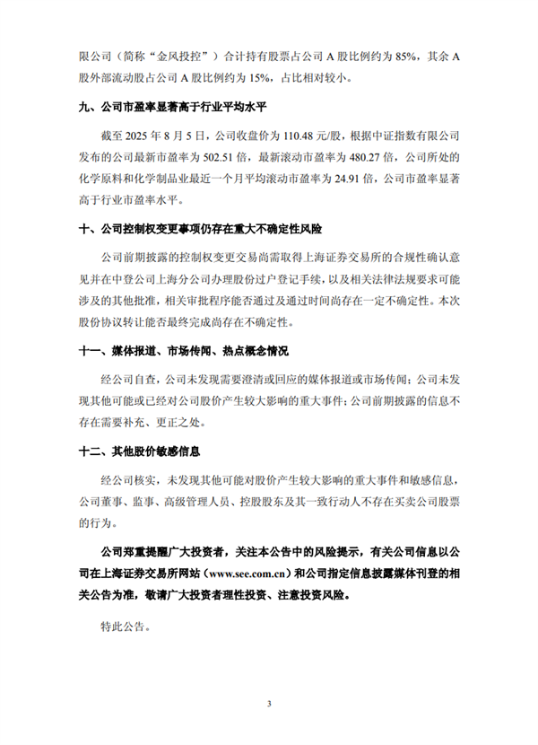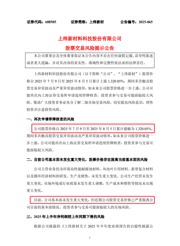 针对这一异常波动,上交所于2025年8月6日发布相关公告,对投资者发出风险提示。公告中明确指出,公司股价近期涨幅与基本面严重背离,存在非理性炒作风险,提醒投资者充分了解市场规律,审慎决策,切勿盲目跟风追涨,防范投资风险。