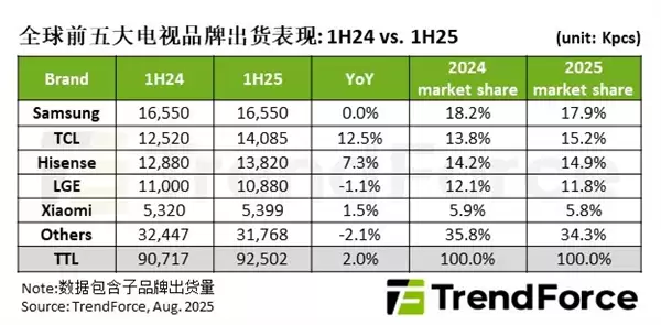 2025上半年全球电视出货量TOP5出炉:小米排名第五