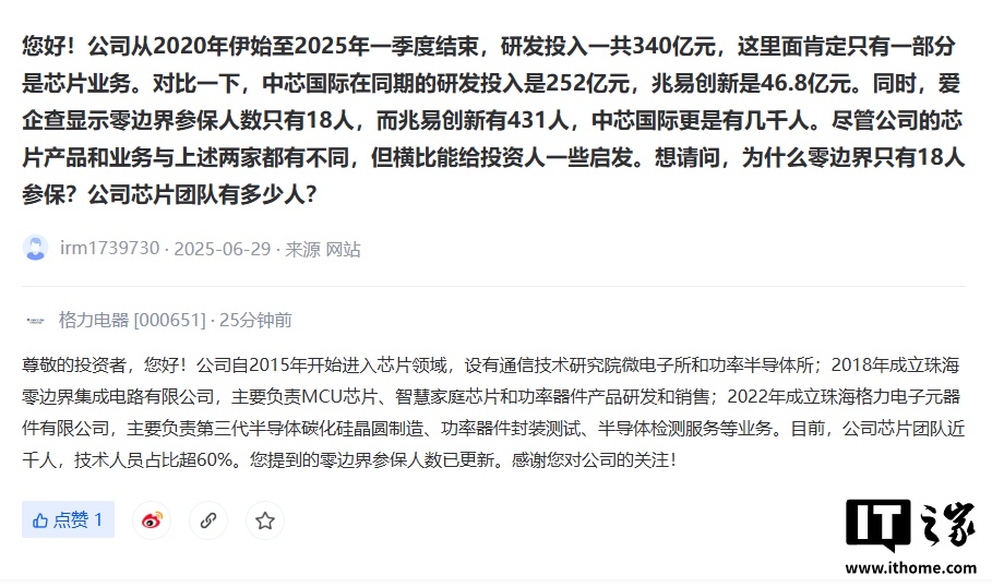8 月 6 日消息,格力电器在互动平台表示,公司自 2015 年开始进入芯片领域,设有通信技术研究院微电子所和功率半导体所。目前,公司芯片团队近千人,技术人员占比超 60%。