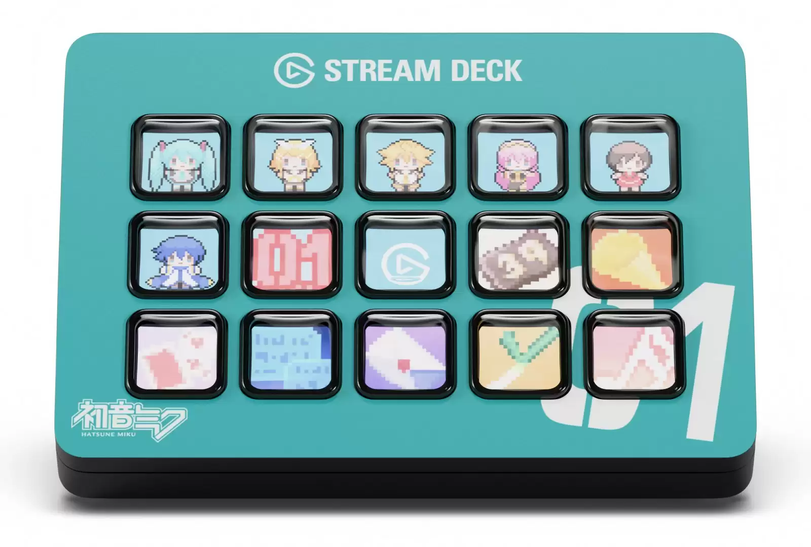 作为Elgato的王牌产品,Stream Deck直播控台自然不会缺席本次联名。Stream Deck MK.2初音未来限定版配备15个可编程LCD按键,特别加入了虚拟歌姬主题的动态图标和独家屏保。