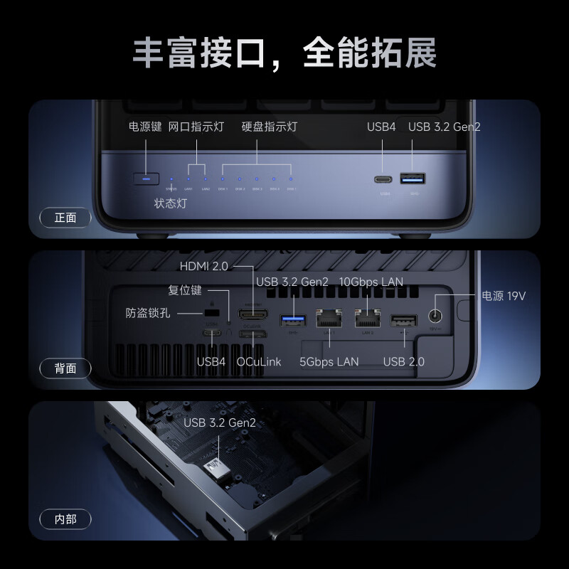 该迷你主机正面提供了 1 个全功能 USB4、1 个 USB-A 10Gbps、电源键和大量状态指示灯;背面则包含安全锁孔、1 个全功能 USB4、1 个 HDMI 2.0、1 个 OCuLink、1 个 USB-A 10Gbps、1 个 5GbE RJ45、1 个 10GbE RJ45、1 个 USB-A 480Mbps 和 DC-in 供电口。