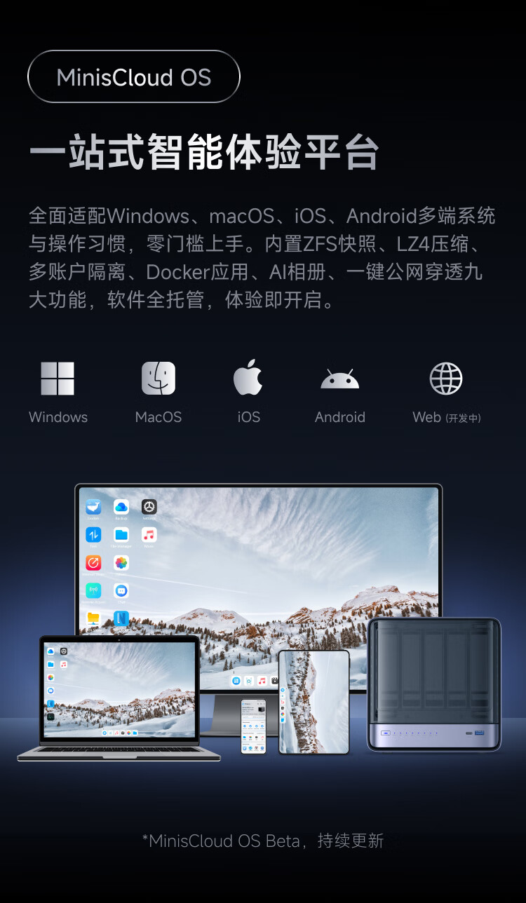 铭凡 NAS 迷你主机 N5 运行 MinisCloud OS 操作系统,支持 ZFS 文件系统、公网穿透、LZ4 无损压缩算法、Docker 容器化、AI 相册整理等功能。