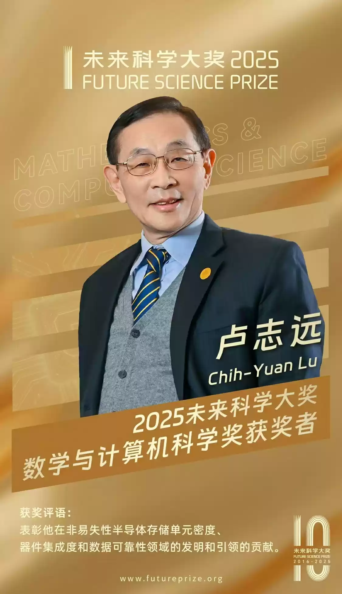 “数学与计算机科学奖”授予卢志远,表彰他在非易失性半导体存储单元密度、器件集成度和数据可靠性领域的发明和引领的贡献。