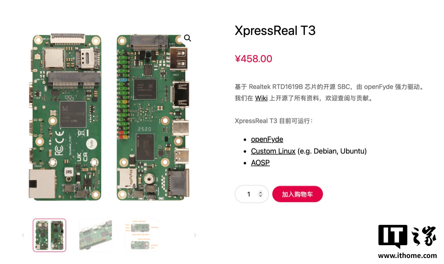 8 月 6 日消息,Fyde 与 Radxa、Realtek 合作推出的 XpressReal T3 开发板现已在国内上市,该板预装 openFyde 系统,同时也原生支持 Debian Linux、安卓等,定价为 458 元。