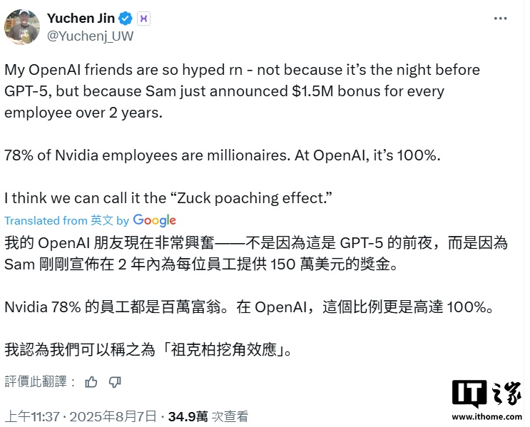 金雨辰将此次大规模奖金发放现象形容为"扎克伯格挖角效应"的直接反应。他表示:"英伟达现有78%的员工已实现百万富翁的身份认同,而现在OpenAI的这一比例将达到令人惊叹的100%。"