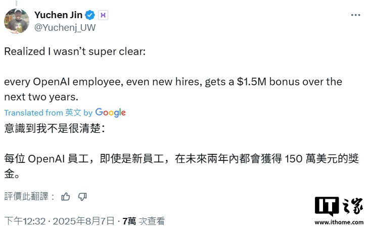8月7日,Hyperbolic AI首席执行官金雨辰(Yuchen Jin)在社交平台X上爆料称,其任职于OpenAI的内部人士透露,公司CEO萨姆·奥尔特曼刚刚宣布了一项震惊业界的员工激励计划——将在未来两年内为每名员工发放150万美元(约合1077.9万元人民币)的高额奖金。