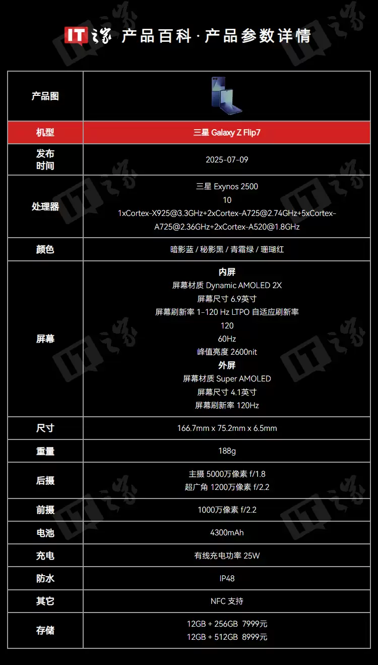 这次 Z Flip7 配置上比较特别的一点,是成为了三星首款搭载自家 Exynos 处理器的 Z Flip 系列机型,具体型号为 Exynos 2500。配置上标配 12GB 内存,存储则有 256GB 和 512GB 可选。