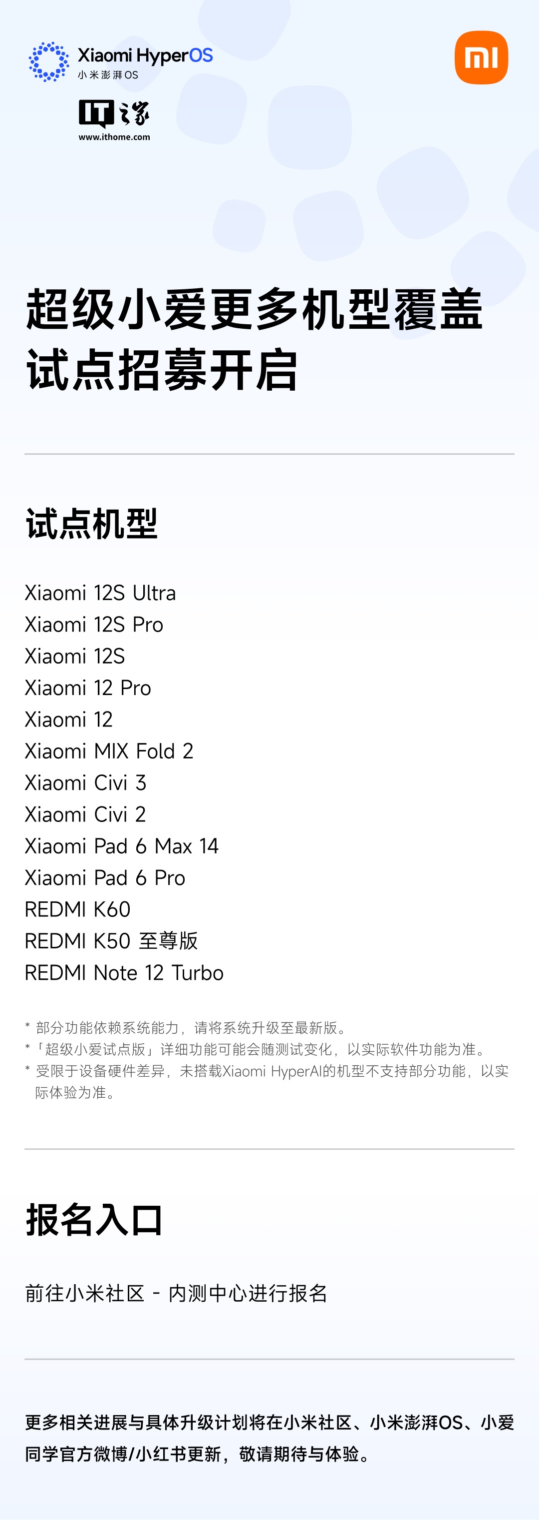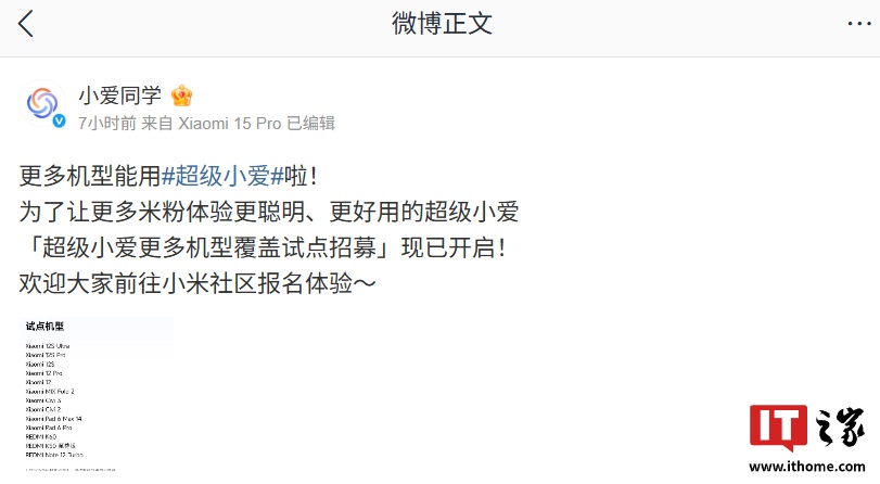 8 月 7 日消息,小米智能助手官方微博 @小爱同学 今日发文宣布,「超级小爱更多机型覆盖试点招募」现已开启。据介绍,更多老机型(含 Xiaomi 12S Ultra、Civi 3 等)可更新使用超级小爱,用户需前往小米社区报名体验。