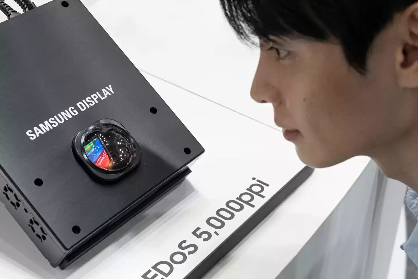 在OLEDoS(Micro OLED)技术领域,三星展示了一系列尖端微型显示屏产品:包括1.3英寸4000PPI像素密度、1000尼特亮度的W-OLED双目显示方案;1.4英寸5000PPI像素密度的RGB OLED显示屏;以及采用微透镜阵列技术的1.3英寸4200PPI像素密度、20000尼特超高亮度的RGB OLED显示方案。