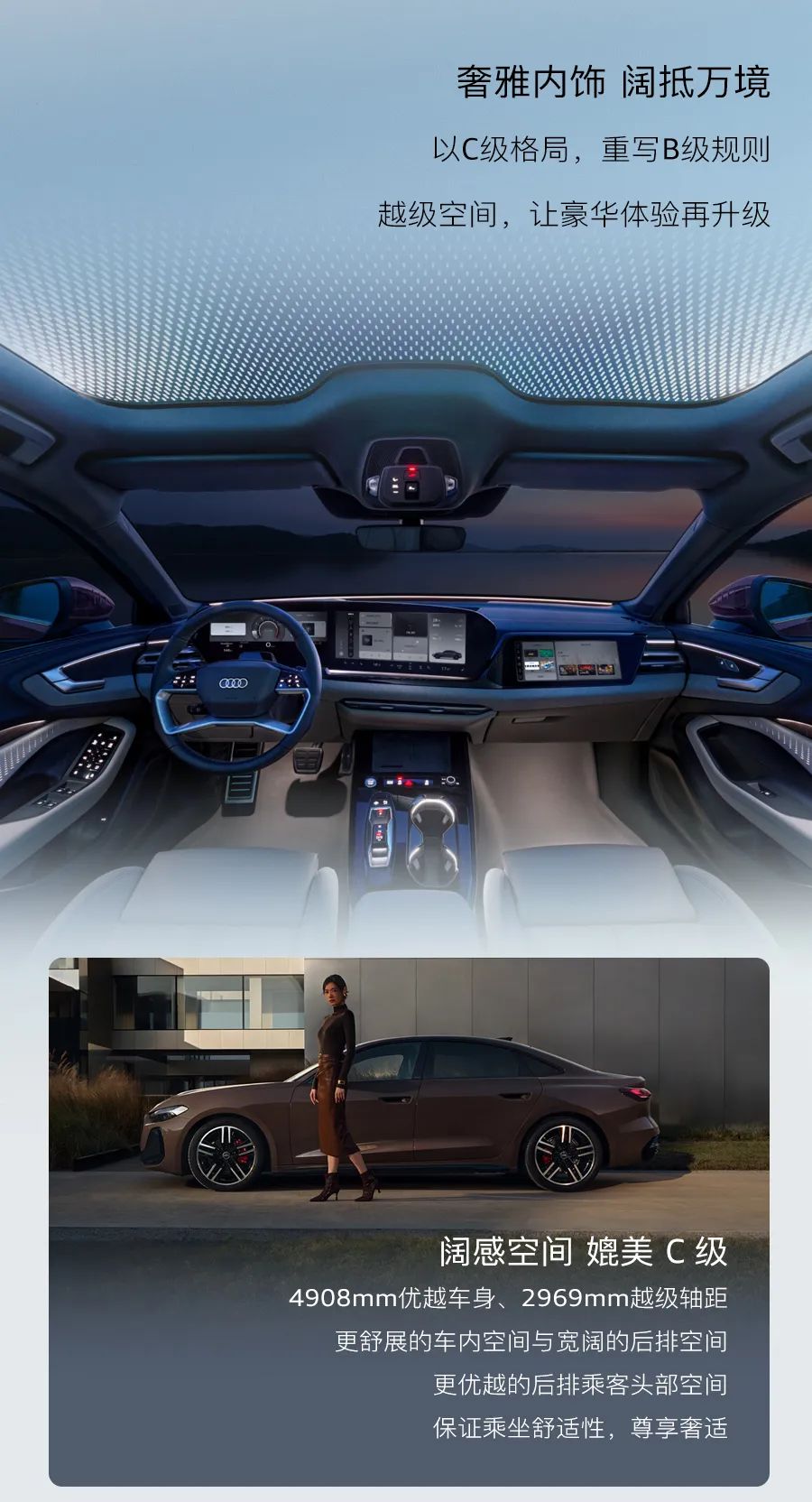 新车搭载全新奥迪 MMI 全景显示屏,由 11.9 英寸的领航视界以及 14.5 英寸全景中控屏、10.9 英寸副驾智慧屏组成,配备专为中国用户匠心打造的“云感座椅”,基于国人形体特征进行深度人机工程学优化,在靠背至大腿 17 个关键位置提供贴合承托。