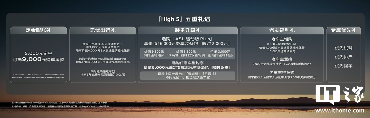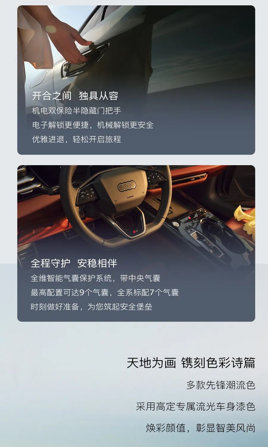 装备升级礼:选购 A5L 运动版 Plus 享价值 16000 元舒享装备包限时 2000 元;选购任意车型均享价值 6000 元高定专属流光车身漆色限时免费