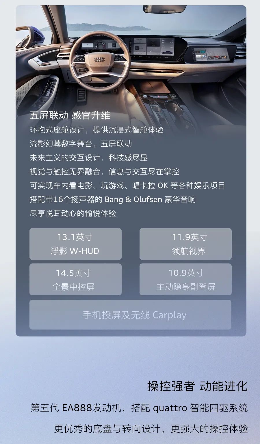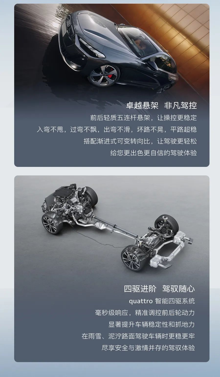 新车采用奥迪最新的 E³ 1.2 电子电气架构,凭借高算力、高扩展性及灵活的迭代能力,为深度接入组合驾驶辅助提供底层支撑。同时,奥迪全新 PPC 豪华燃油智能平台采用第五代 EA888 发动机,拥有 200kW 峰值功率。
