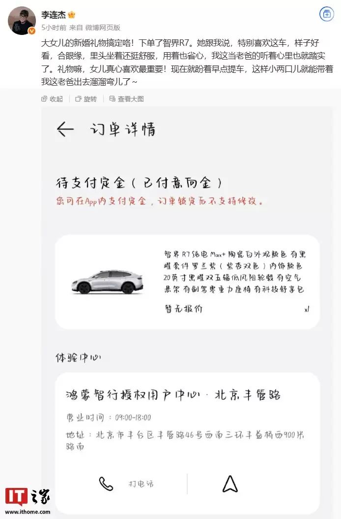 值得一提的是,影星李连杰今日也在微博晒出了自己的智界 R7 订单,称是送给大女儿的结婚礼物。