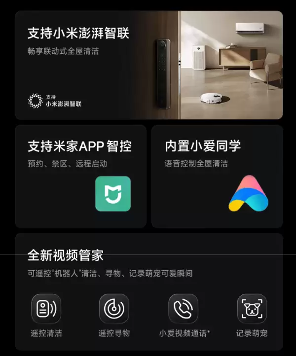 此外,它还支持 AI 智能交互,内置小爱同学,支持小米澎湃智联、支持米家 App 智控,可实现联动式全屋清洁,预约、禁区、远程启动。