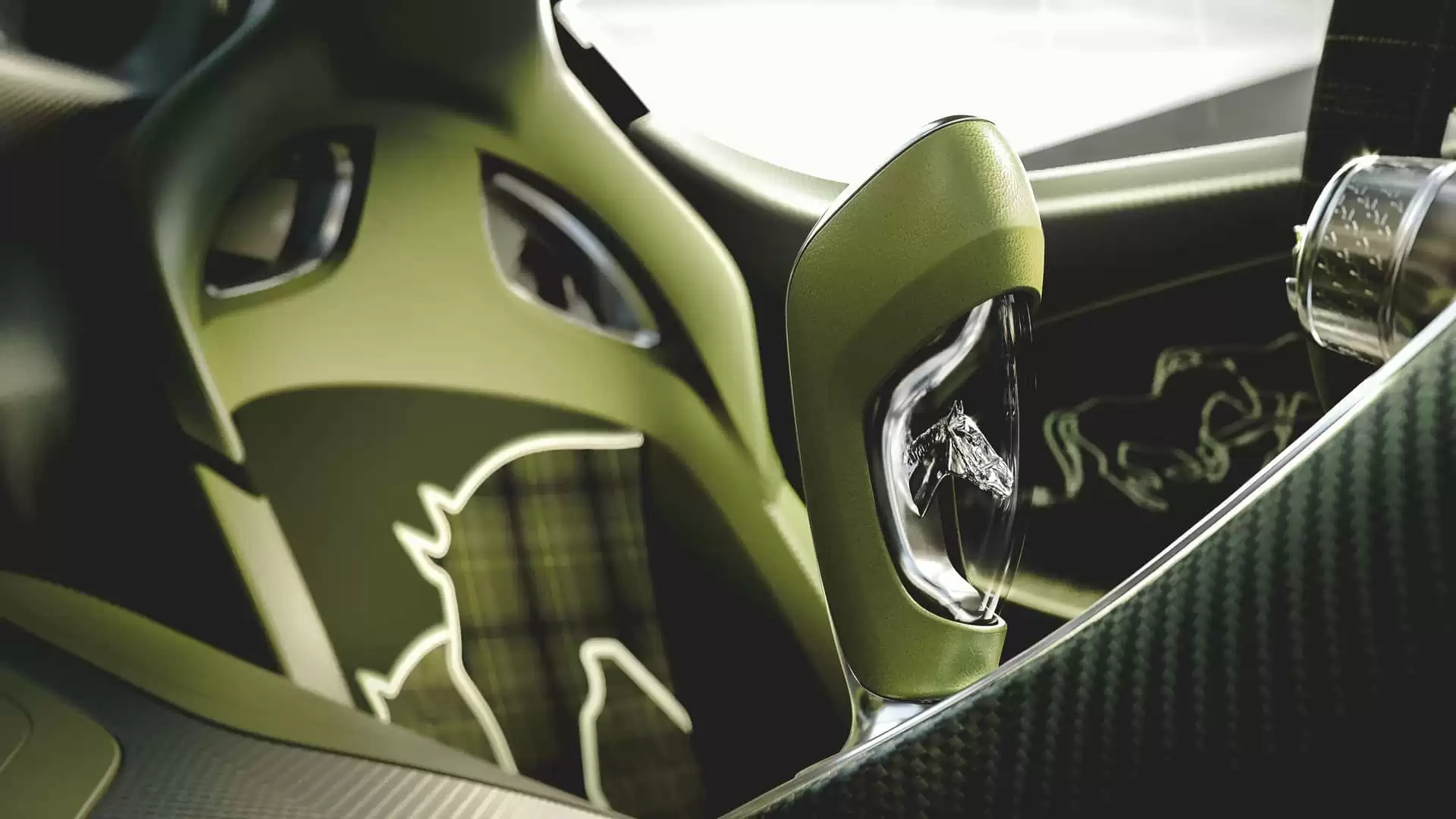 内饰融合定制格纹织物、翠绿色碳纤维饰板与精密加工的铝制部件。车门与座椅靠背绣着骏马图案,致敬创始人埃托雷・布加迪对马术的热爱。座椅根据车主身形量身定制,铝制换挡杆内更镶嵌着精致的马首徽章。
