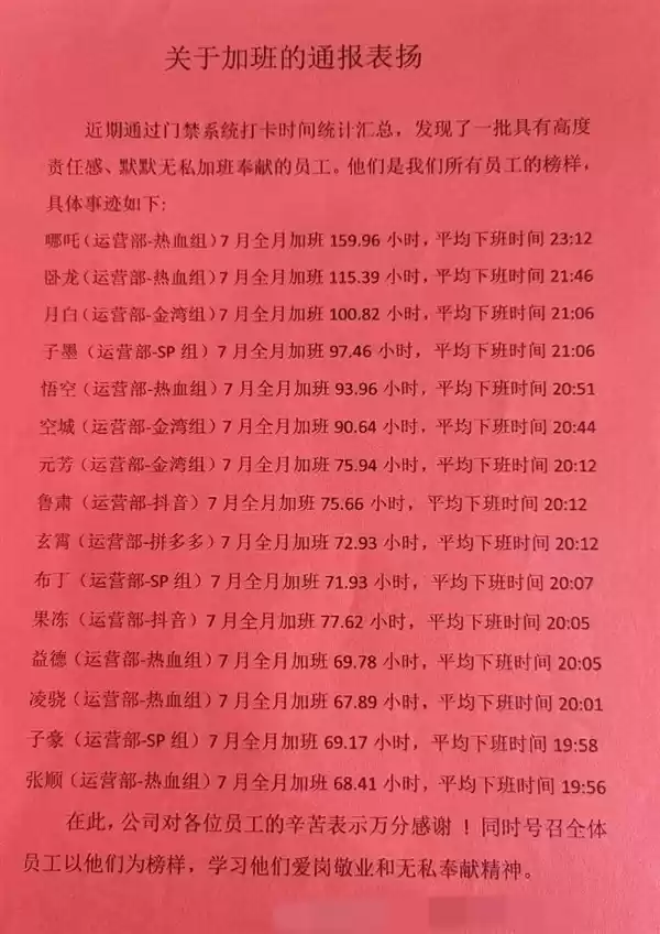 8月8日消息,据媒体报道,一家电商公司发布的《加班通报表扬》在社交平台上引发热议。表扬信中的榜一员工加班159.96小时,平均下班时间是23:12,公司号召全体员工以他们为榜样,学习他们爱岗敬业和无私奉献精神。