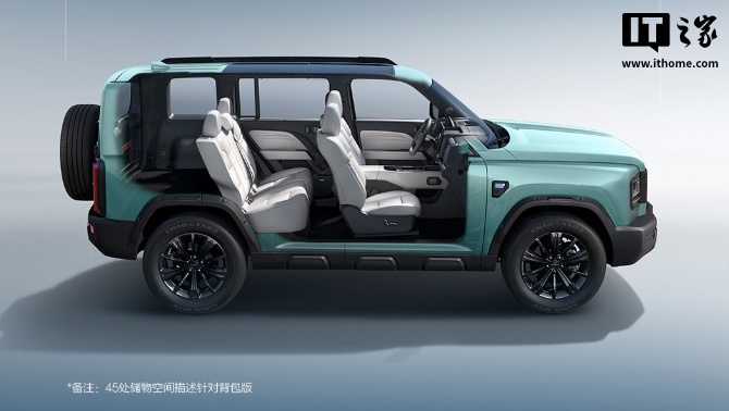 该车提供揽月白、水墨江南灰、玄夜黑、云涧灰、薄荷绿车漆,整体延续“方盒子”外观设计,前脸换用与燃油版相同的方形头灯组,车身匹配传统造型门把手;车尾标识由现款的“HAVAL”改为“GWM”,尾灯同步换用全新设计。