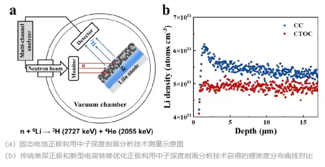 近期,中核集团中国原子能科学研究院与清华大学深圳国际研究生院合作,依托中国先进研究堆平台,采用中子深度剖面分析技术,精准识别了全固态锂电池传统单层正极结构的关键缺陷。研究团队首次通过实验直接观测并量化了电极内部锂浓度沿厚度方向存在的显著梯度分布现象,为实现电极层内锂元素的均匀分布提供了重要实验支撑,为推动全固态锂电池的基础理论研究与工程应用做出了关键贡献。