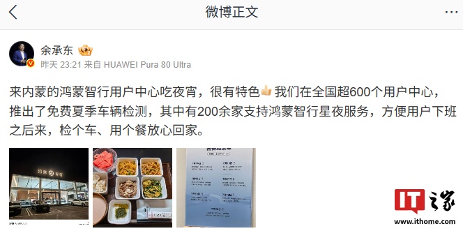 据此前报道,鸿蒙智行 / AITO 用户中心常被车主戏称为“鸿蒙大酒店”或“问界大酒店”。华为常务董事、终端 BG 董事长余承东在今年 7 月 17 日晚就分享了自己在内蒙支持星夜服务的用户中心的体验。包括免费夏季车辆检测、用餐体验(微博配图展示有四菜一汤 + 水果,以及周菜单)等。