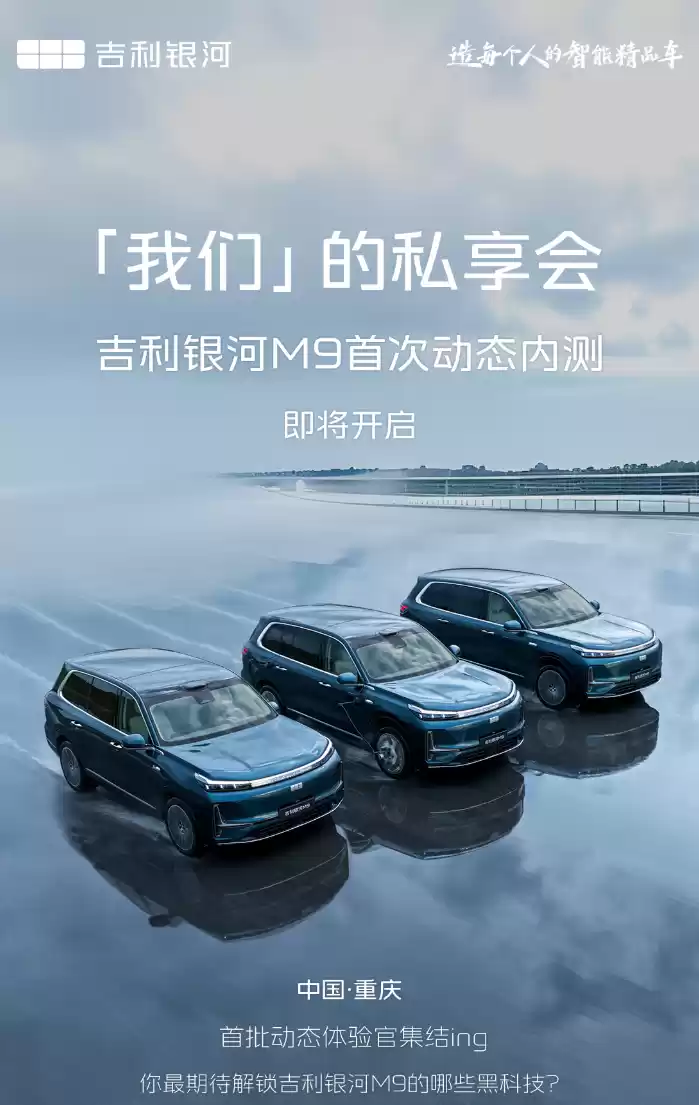 8 月 9 日消息,吉利银河新能源今日宣布,吉利银河 M9 首次动态内测即将在重庆开启。该车于 5 月在意大利米兰发布,但并未公布上市时间以及价格信息。新车定位家族旗舰,官方将其形容为“豪华满配的家”。