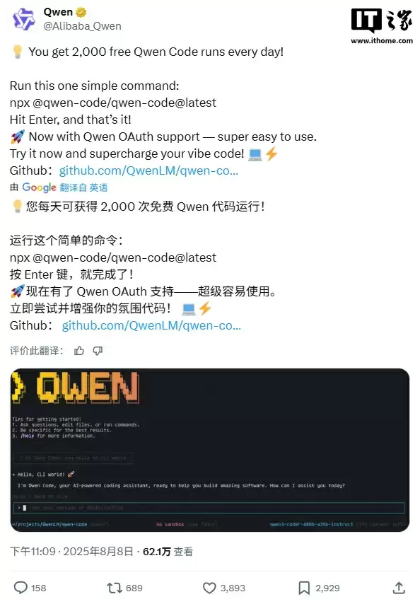 8 月 9 日消息,阿里云通义千问官方宣布,AI 编程智能体 Qwen Code 用户每天可免费获得 2000 次(请求)运行权限,且没有 Token 限制。