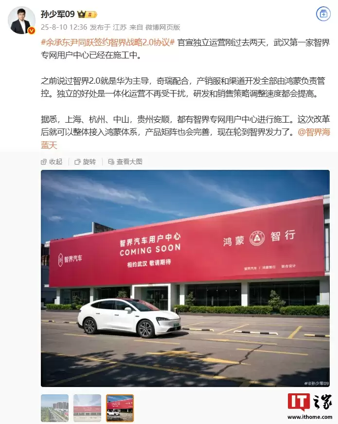 据行业博主 @孙少军 最新消息,在宣布独立运营仅两天后,**武汉首家智界专属用户中心已启动建设**。此外,上海、杭州、中山及贵州安顺等地也在同步推进专网用户中心的建设工作。**完成此次升级后,智界将全面接入鸿蒙生态系统**,产品布局也将更加完善。