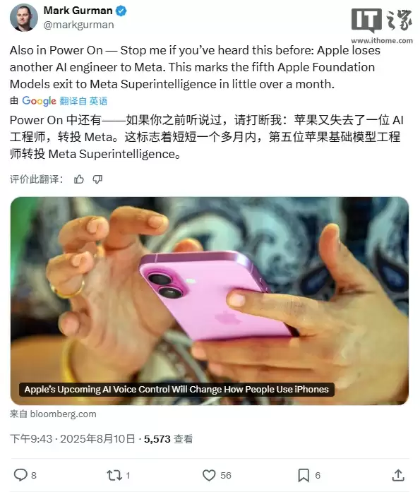 注意到8月10日最新动态,彭博社记者马克・古尔曼透露,苹果公司又一位人工智能工程师选择离职。这意味着近一个半月内,已有至少五位专注于基础模型研发的苹果AI工程师转投Meta旗下的超级智能实验室。