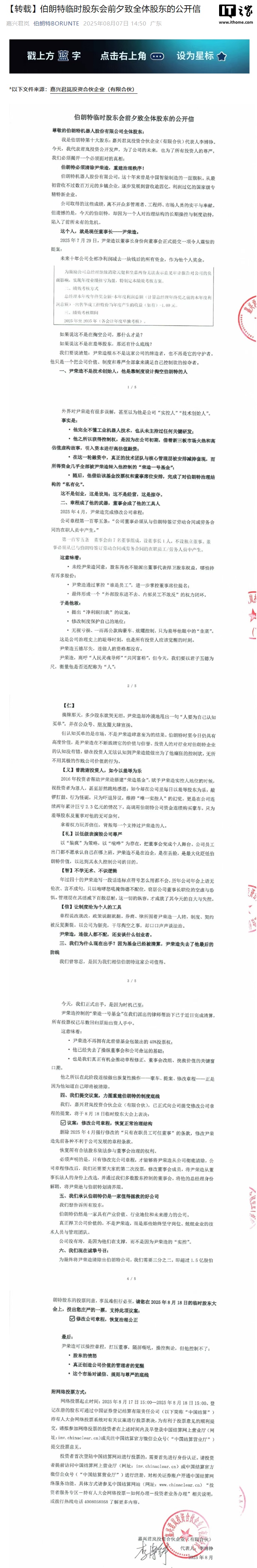注意到,8 月 7 日,伯朗特官方公众号以转载的形式发布了投资方之一 —— 君岚投资的一则致全体股东公开信。信中指出伯朗特机器人现任董事长兼总经理尹荣造靠制度设计掏空伯朗特、羞辱股东,并号召股东投票同意修改公司章程、恢复正常治理结构,将尹荣造清除出伯朗特公司。