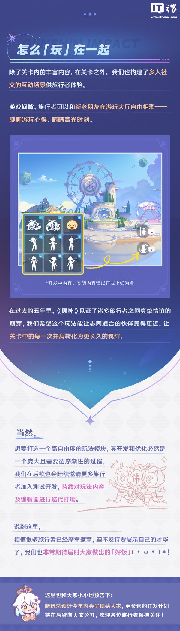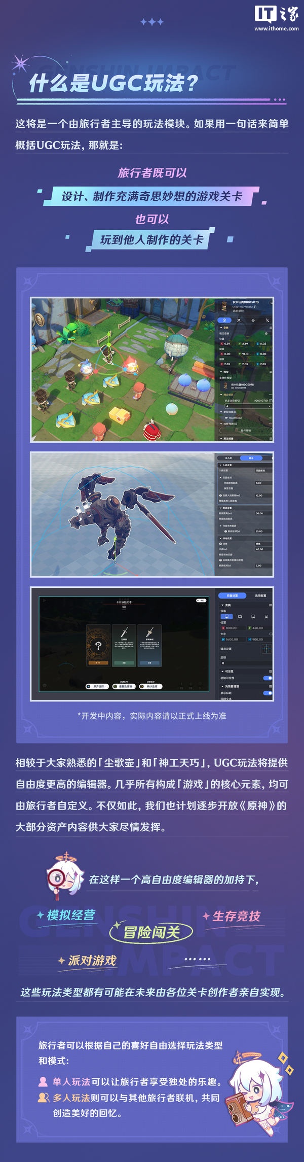 另外,《原神》UGC 玩法可在高自由度编辑器的加持下,实现模拟经营、冒险闯关、生存竞技、派对游戏等玩法。这些玩法类型都有可能在未来由关卡创作者亲自实现,并且支持选择单人玩法和多人玩法。目前新玩法和还在持续打磨,预计将在今年内呈现给用户。