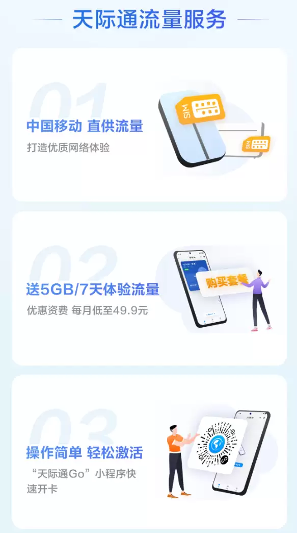 华为天际通服务采用中国移动直供流量,免费赠送5GB/7天体验流量,月包99元,含2000GB流量,年包599元,月享2000GB流量。
