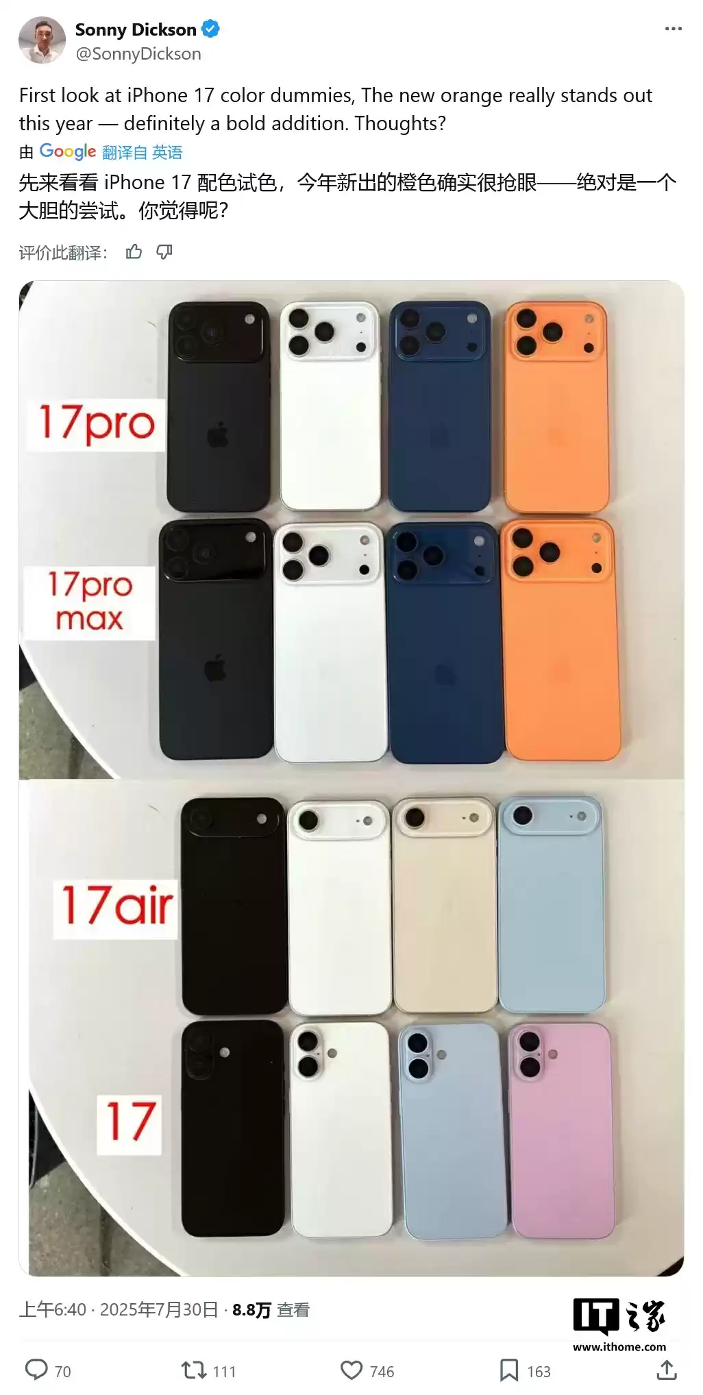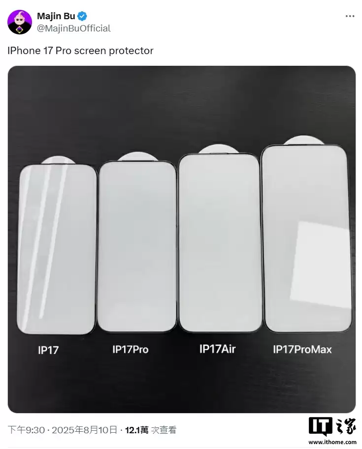 8 月 11 日消息,消息人士 Majin Bu 今天在 X 平台曝光了苹果 iPhone 17 全系列手机的贴膜。