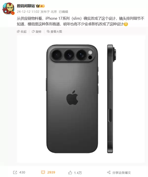 12月17日消息,日前,数码博主“数码闲聊站”爆料称,根据供应链消息,iPhone17系列的后摄模组将改为条形跑道设计。