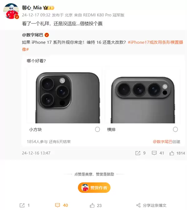 今日,REDMI产品经理胡馨心转发iPhone17外观设计的相关微博,对于横向后摄模组的设计,胡馨心称“看了一个礼拜,还是没适应。”