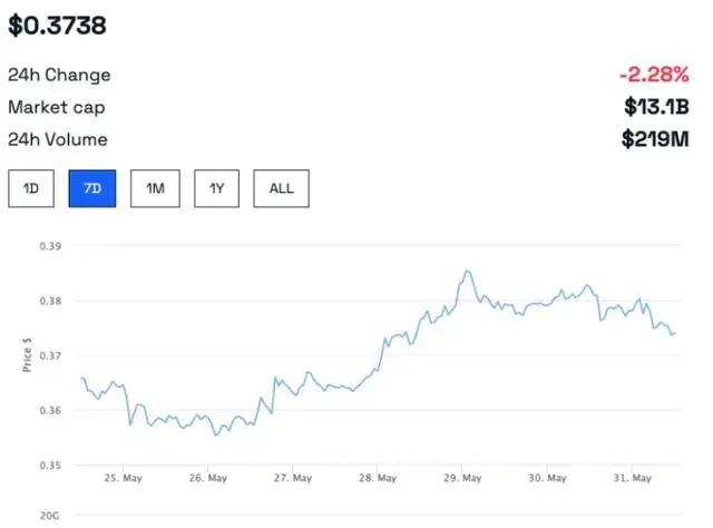 从周线图来看,ADA当前报价0.375美元,周涨幅1.9%。该代币在触及0.35美元支撑位后企稳反弹,并在5月29日创下0.385美元的周内新高。