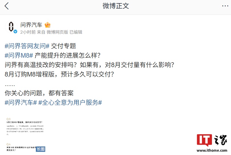 8 月 11 日消息,问界汽车官方今日发布“关于问界用户近期热门问题(第十期)”,针对高温技改对交付的影响、增程版交付时间、引入铁路发运的原因等问题进行了解答。
