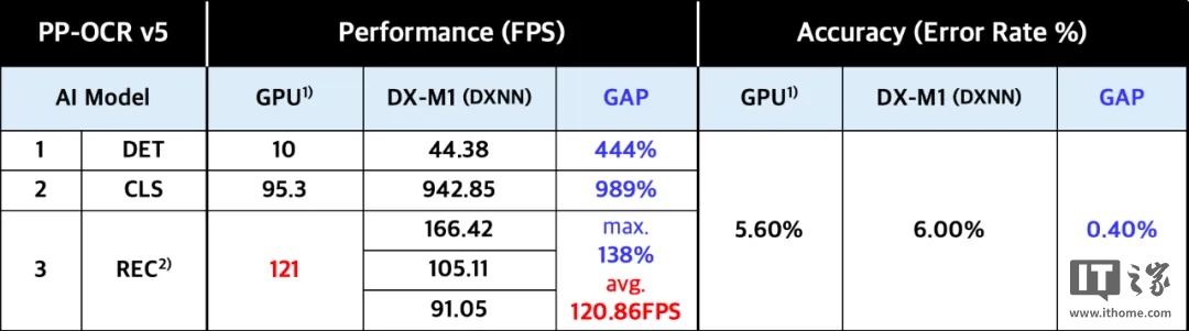 在实测环节中,DX-M1 与 GPU(英伟达 RTX 2080Ti)横向对比时,前者在关键指标上表现亮眼,可在更低的功耗效率下实现更高的每秒帧数(FPS),同时在模型识别精度上表现更优。