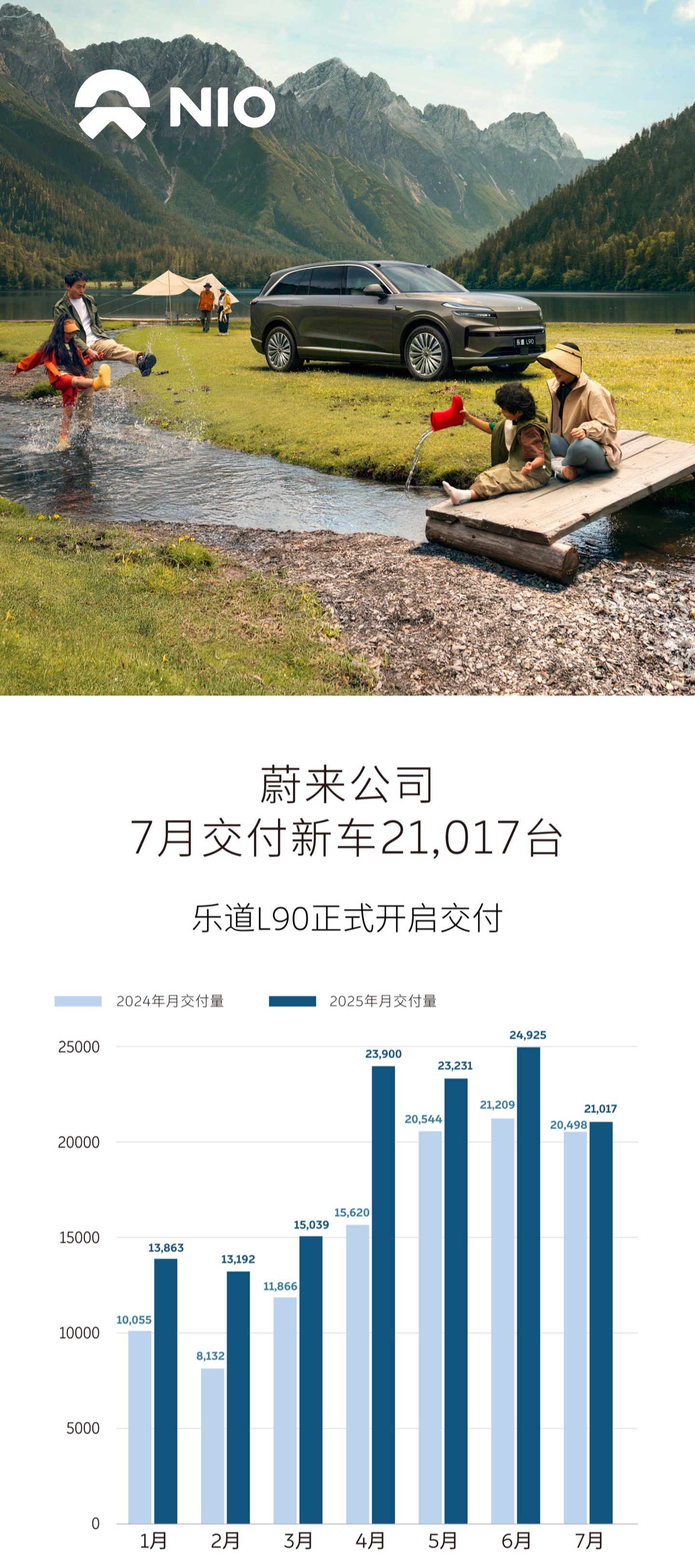 销售数据显示:2025年7月蔚来集团共交付新车21,017台,1-7月累计销量同比增长25.2%。具体来看,蔚来品牌交付12,675台,乐道品牌贡献5,976台,firefly萤火虫品牌交付2,366台。截至当前,集团累计交付量已达806,731台,其中蔚来737,923台,乐道58,599台,firefly萤火虫10,209台。