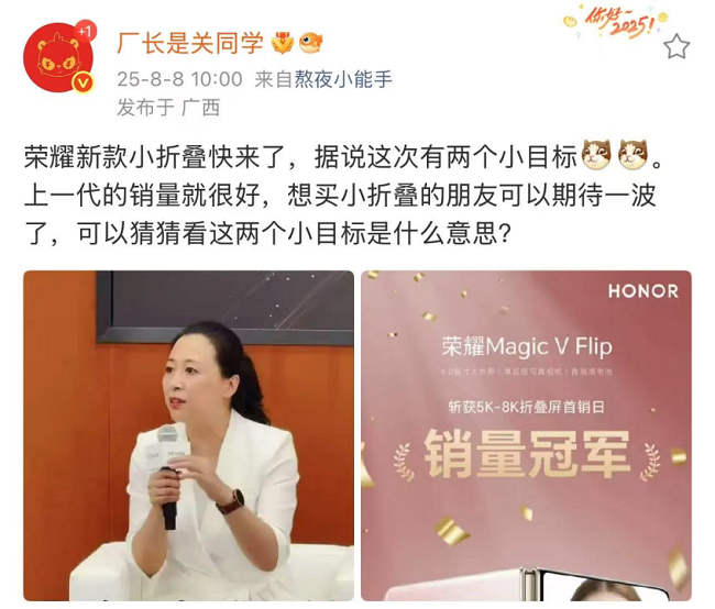 8 月 8 日,数码 KOL@厂长是关同学 也发微博表示称“荣耀小折叠快来了,据说这次有两个小目标,可以猜猜看”。两个小目标,既让网友们联想到荣耀 Magic V Flip2 有可能在两个功能点上迎来大升级,比如外观和电池、外观和影像、影像和电池等等,又让人猜测这款产品可能会带来 2 亿像素的影像配置。