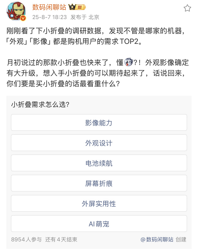 这之后,有关荣耀 Magic V Flip2 配置爆料信息也越来越多,数码 KOL@数码闲聊站也不时透露过产品相关信息。上周 8 月 7 日,数码闲聊站发微博称,“月初说过的那款小折叠(即荣耀 Magic V Flip2)也快来了,外观影像确定有大升级”,引发众多机圈爱好者的关注。