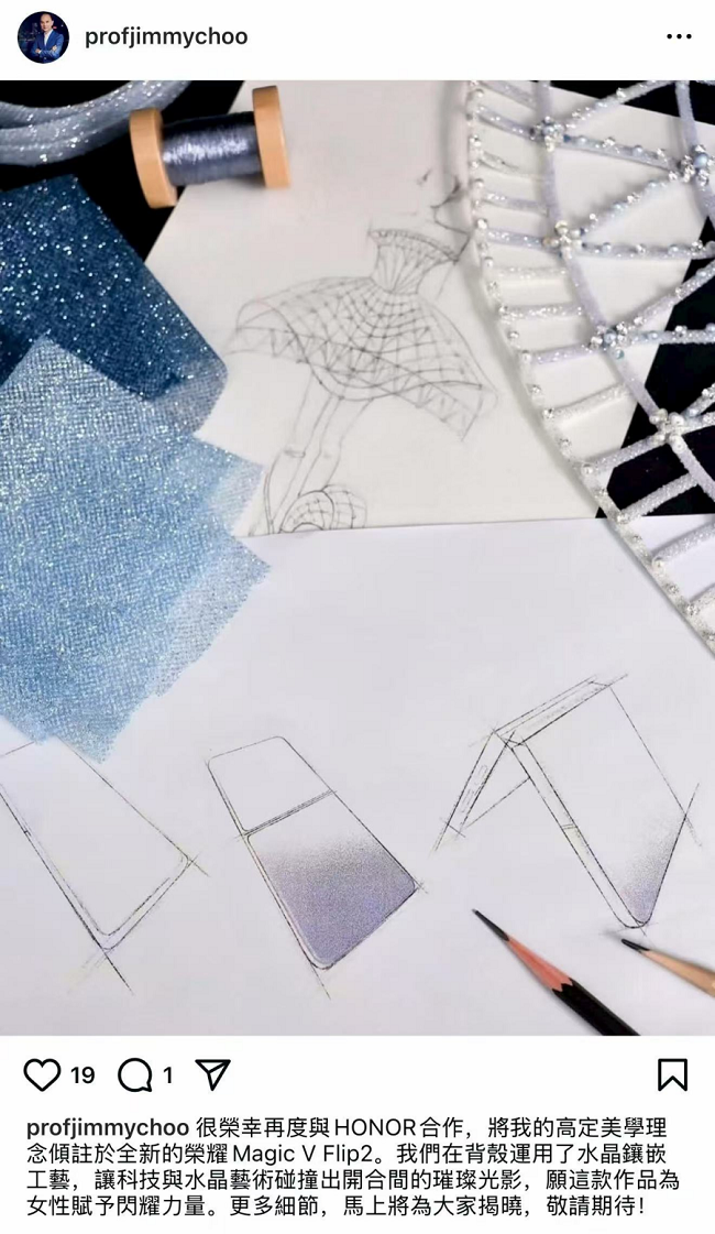 也就在方飞回应爆料信息的同一天,国际时尚大师 Prof. Jimmy Choo 周仰杰博士发布了荣耀 Magic V Flip2 的高定设计手稿,并配文:“很荣幸再度与 HONOR 合作,将我的高定美学理念倾注于全新的荣耀 Magic V Flip2。我们在背壳运用了水晶镶嵌工艺,让科技与水晶艺术碰撞出开合间的璀璨光影,愿这款作品为女性赋予闪耀力量。”去年,荣耀就与周仰杰博士进行合作,打造了以水晶与祖母绿为主元素的高定款,收获了一众用户的芳心。此番再度携手,势必将带来更具时尚感与辨识度的设计升级。