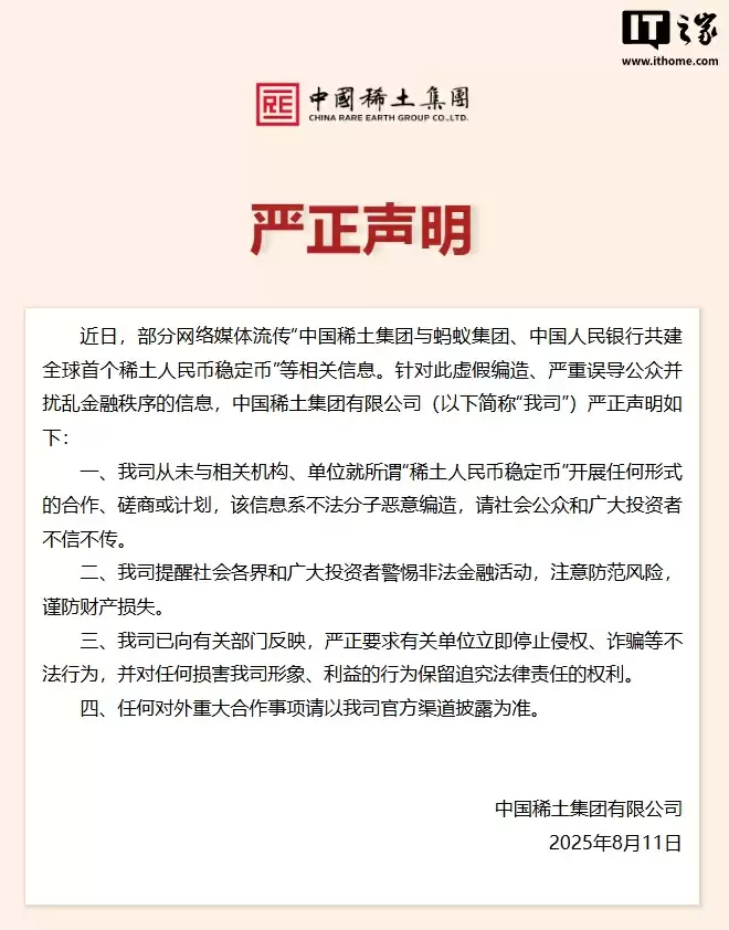 8 月 11 日消息,中国稀土集团今日发布严正声明,整理如下: