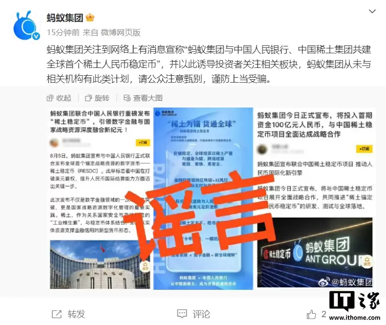 注意到,蚂蚁集团今日早些时候发文,关注到网络上有消息宣称“蚂蚁集团与中国人民银行、中国稀土集团共建全球首个稀土人民币稳定币”,并以此诱导投资者关注相关板块,蚂蚁集团从未与相关机构有此类计划,请公众注意甄别,谨防上当受骗。